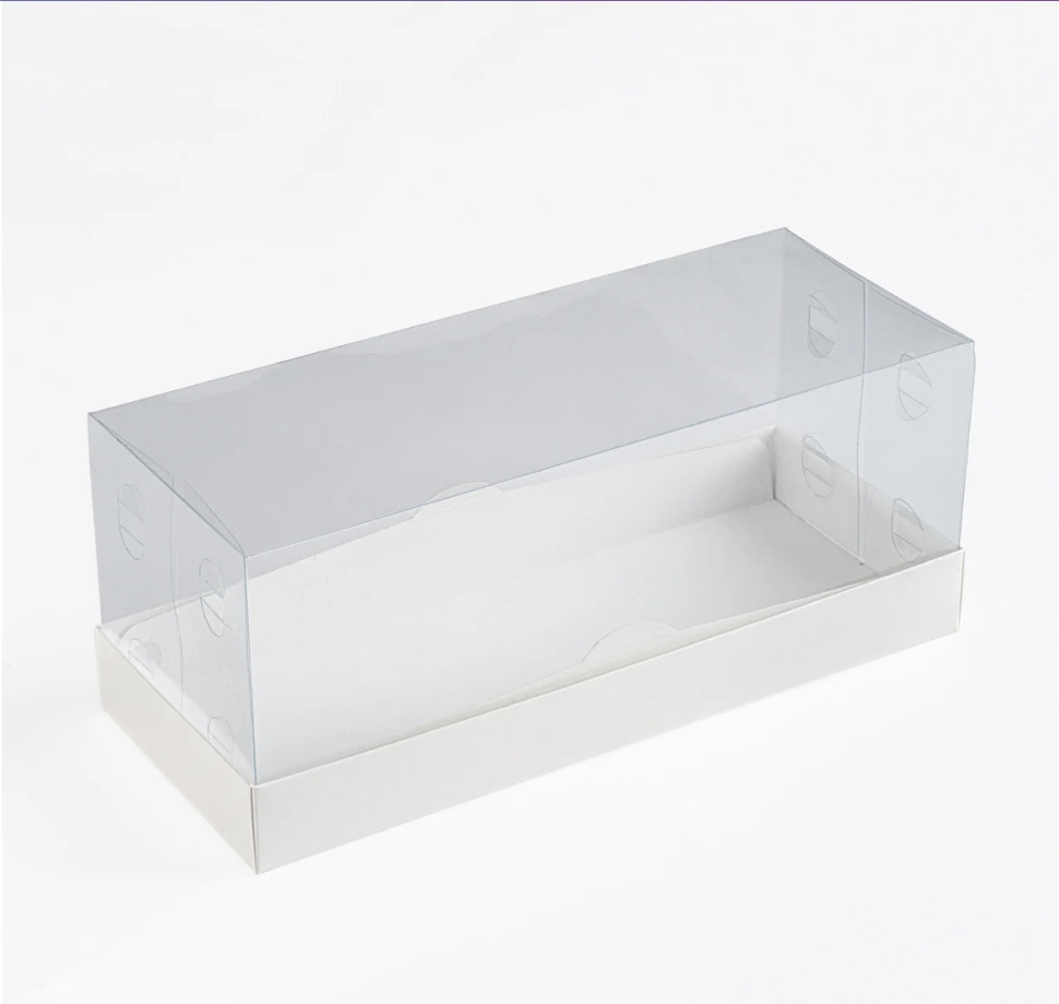 Картонная коробка с прозрачной пластиковой крышкой идеально подходит для упаковки бисквитного и меренгового рулета, кекса, штоллена и других кондитерских изделий.