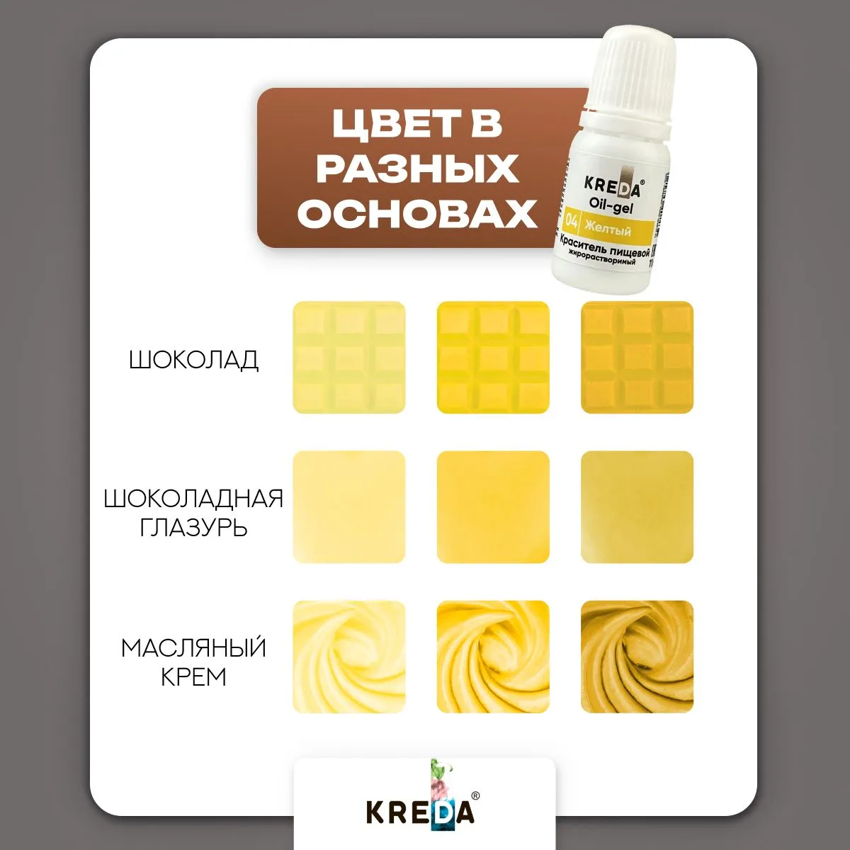 Жирорастворимые пищевые красители Kreda Bio Oil-gel обладают широким спектром цветов, имеют высокую красящую способность и экономичны в использовании. Удобный дозатор позволяет чётко отмерять нужное количество капель, а благодаря гелевой основе красителя окрашиваемый материал не меняет консистенцию. Идеально подходят для десертов, мороженного, фруктового льда, кремов и соусов