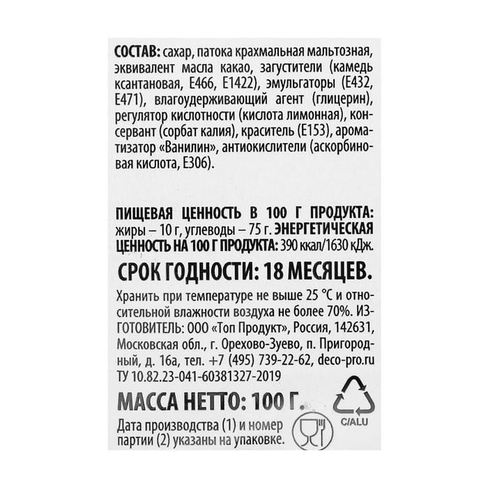 Состав: сахар, патока крахмальная мальтозная, эквивалент масла какао, загустители (E415, E466, E1422), эмульгаторы (E432, E471), влагоудерживающий агент (E422), регулятор кислотности (Е330), консервант (E202), краситель (E153), ароматизатор «Ванилин», антиокислители (Е300, Е306).