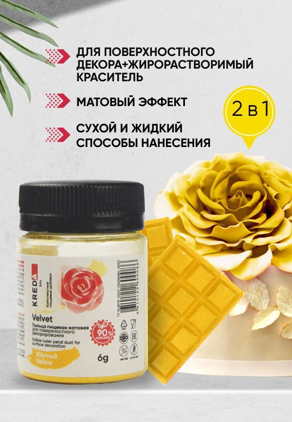 С помощью бархатной матовой пыльцы (красителя жирорастворимого) Velvet можно оживить и придать реалистичность любому десерту и окрасить в массе основы с содержанием жира более 50%. Для декорирования достаточно затонировать лепестки цветов из крема или шоколада, чтобы они «ожили» и стали как настоящие. Яркие плотные цвета и нежные пастельные оттенки Velvet поднимут кондитерское творчество на профессиональный уровень. Для окрашивания в массе добавить сухой краситель в основу, тщательно перемешать до получения однородного оттенка. Пыльца пищевая содержит не менее 90% натуральных ингредиентов в составе. Без вкуса и запаха.